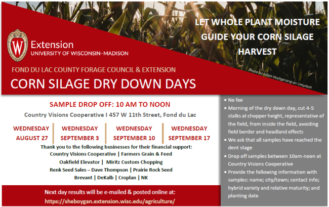 The Fond du Lac County Forage Council, along with UW Madison Division of Extension, Eastern Wisconsin DHIC, Rock River Lab & Dairyland Labs are hosting several opportunities for growers to assess whole plant moisture.